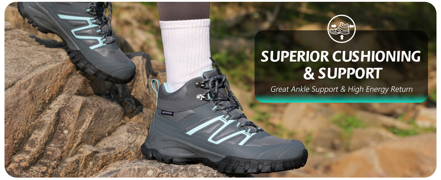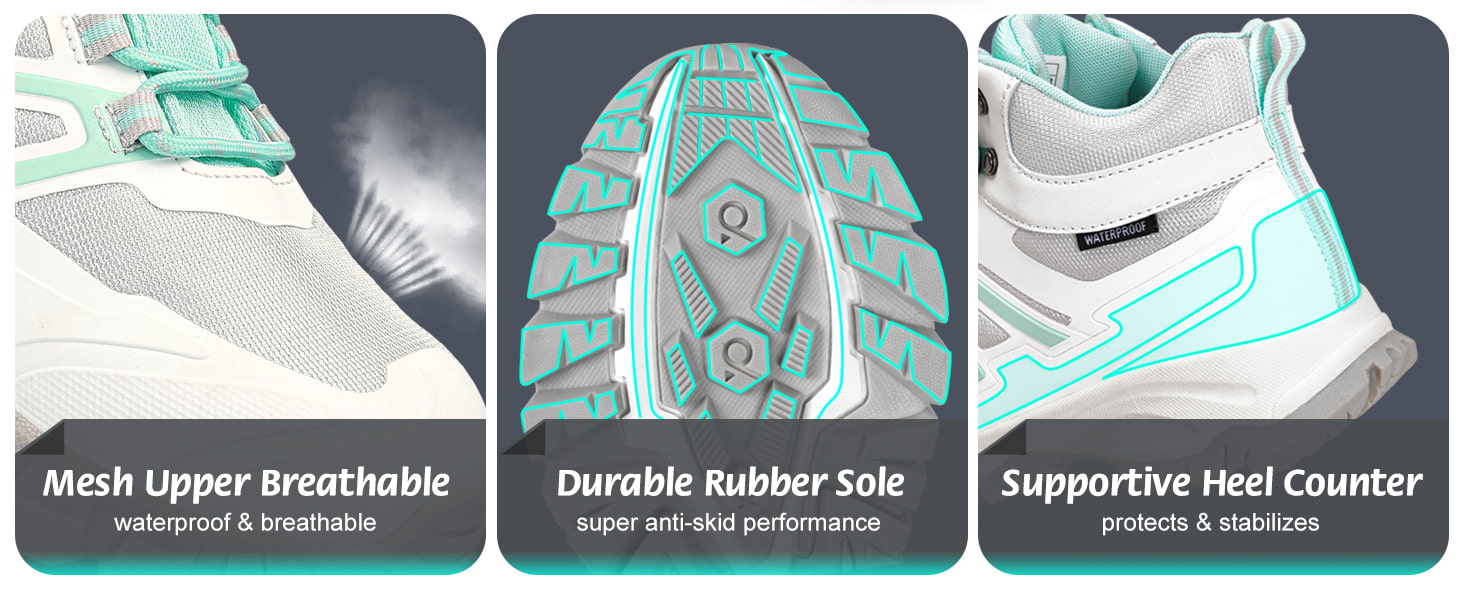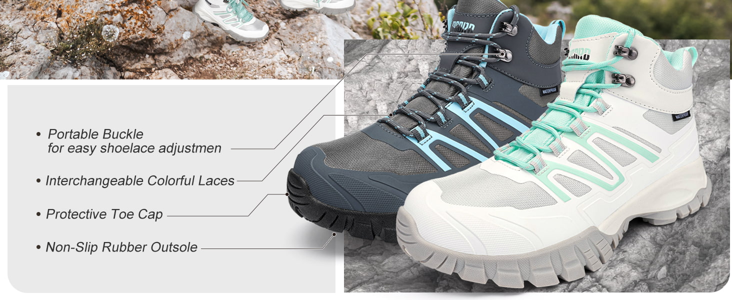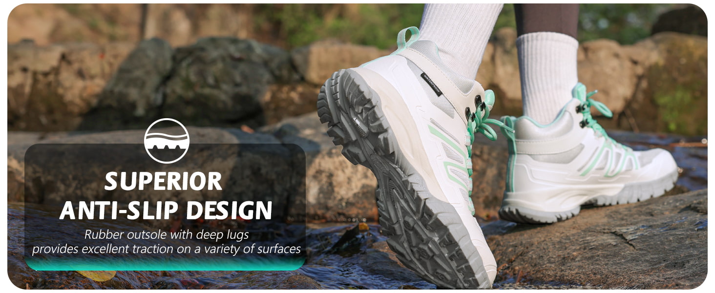 - All-Day Comfort Technology: Combining a cushioned EVA midsole with arch support and elastic insole, these comfortable women's hiking boots reduce foot fatigue during long-distance walking and travel.