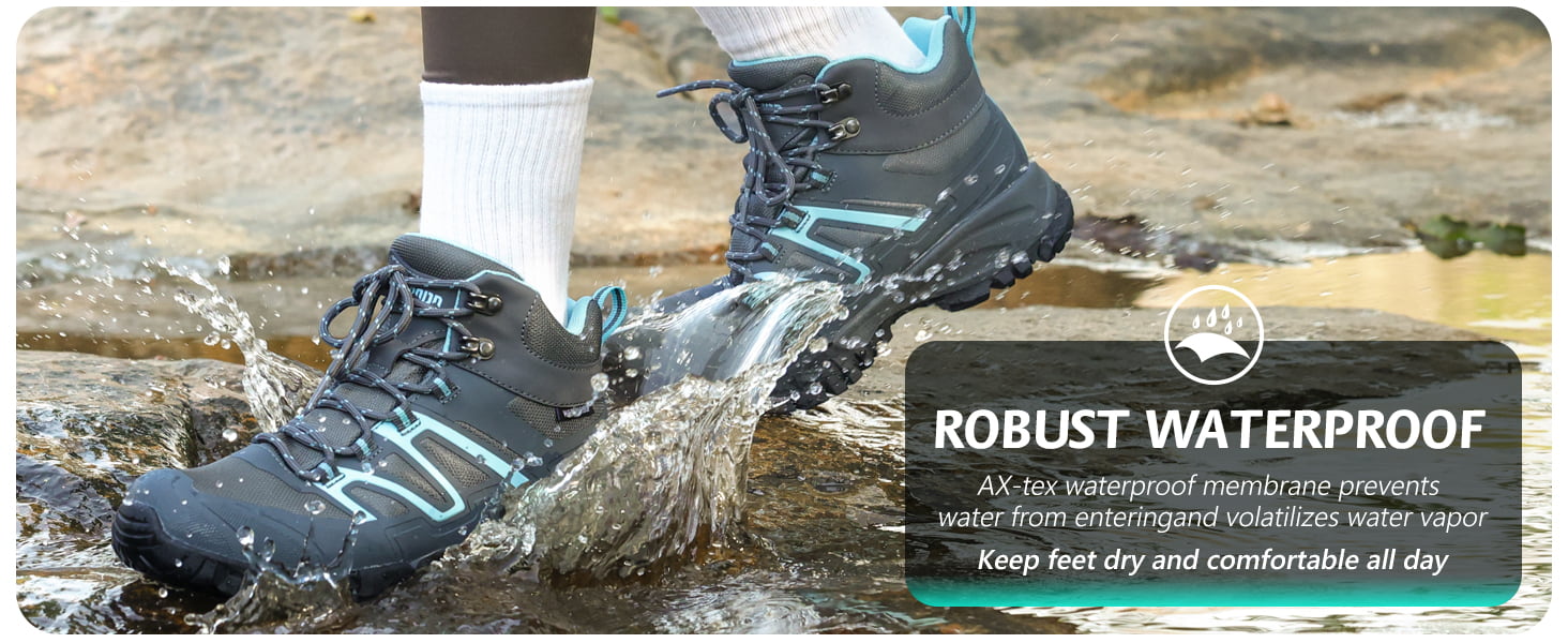 - Waterproof & Breathable: These women's hiking boots feature a waterproof membrane that keeps feet dry in rain and streams while allowing sweat to escape. Ideal for wet trails, summer hikes, and multi-day backpacking trips with all-day comfort.