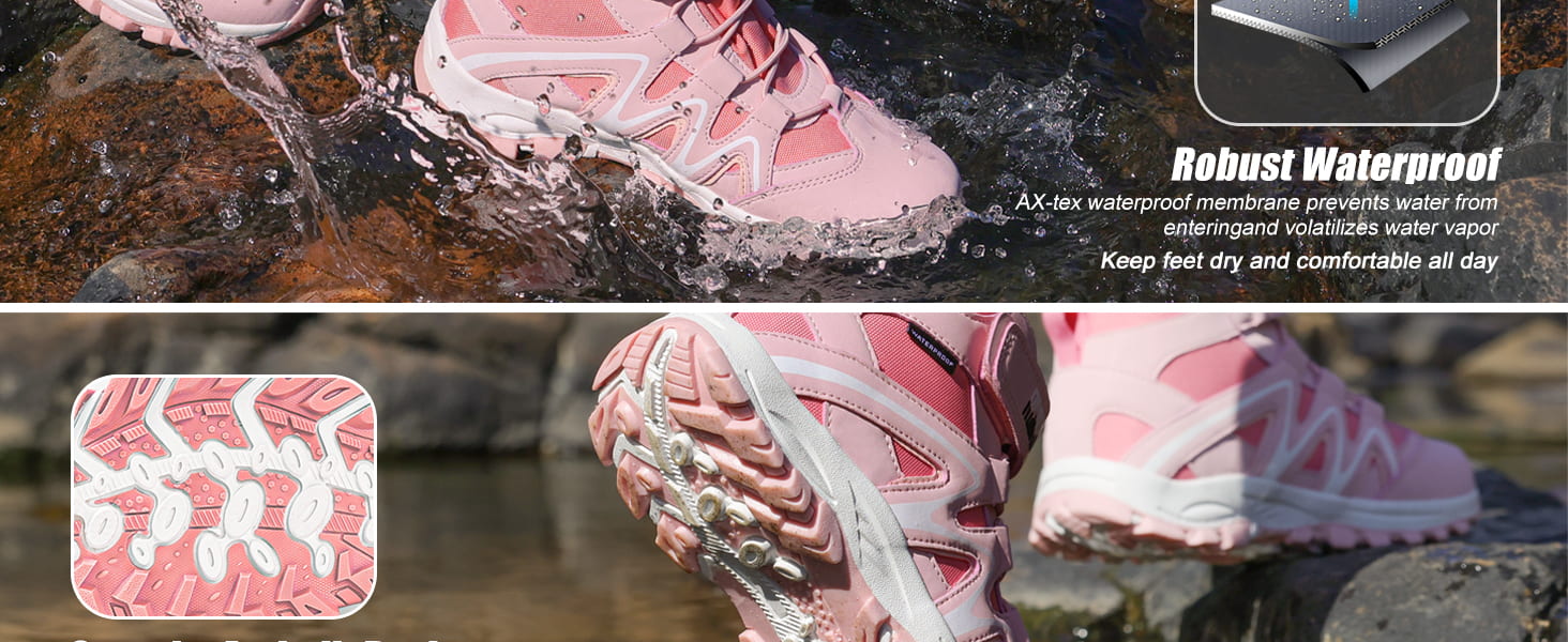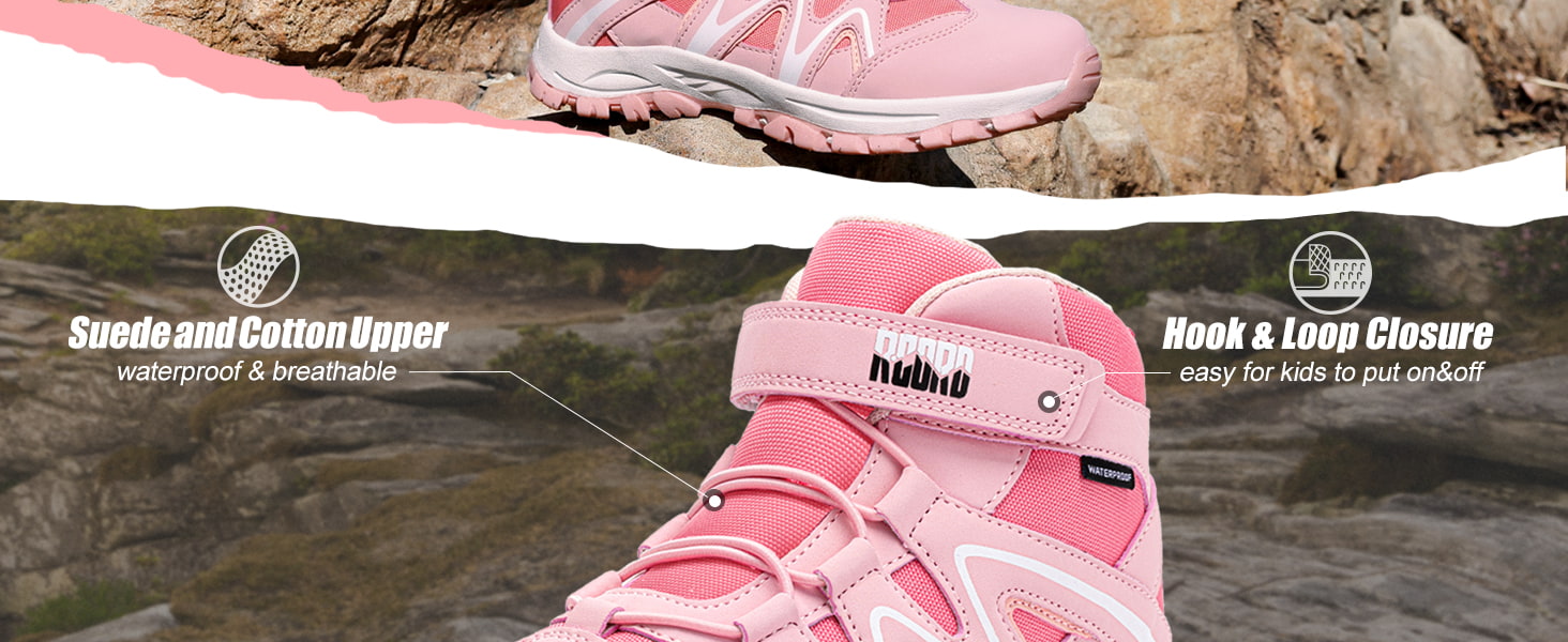 • Waterproof & Breathable: The high-grade waterproof fabric made through many tests and improvements is used, keep your kids' feet dry and comfortable in any weather. Soft insoles and breathable comfy lining wear can keeps your child's feet comfortable walk outdoors, play, hike, climb all the day.